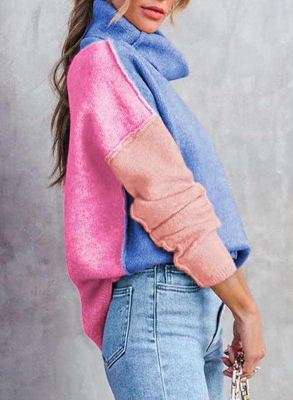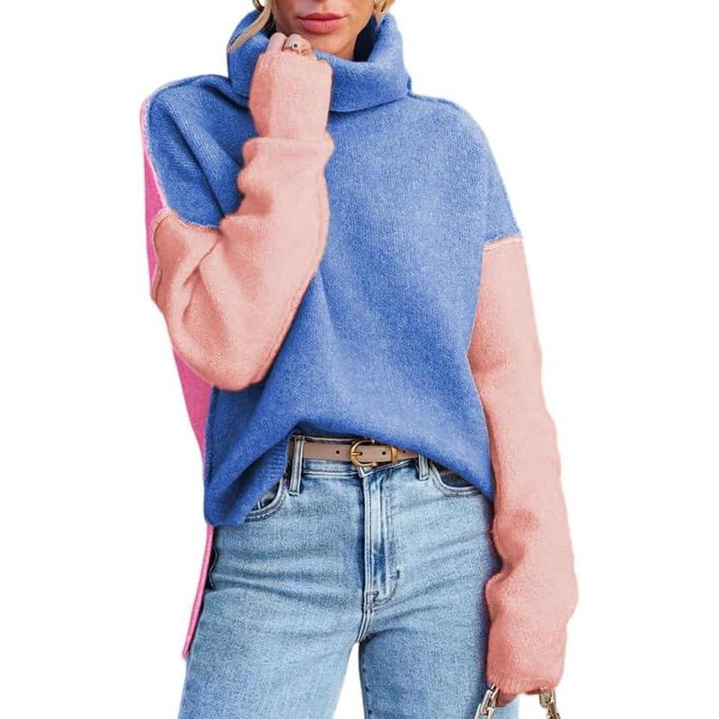 Dokotoo Womens Turtleneck Sweaters Casual Long Sleeve Color Block Side Slit Pullover Knit Jumper Tops(Sky Blue)