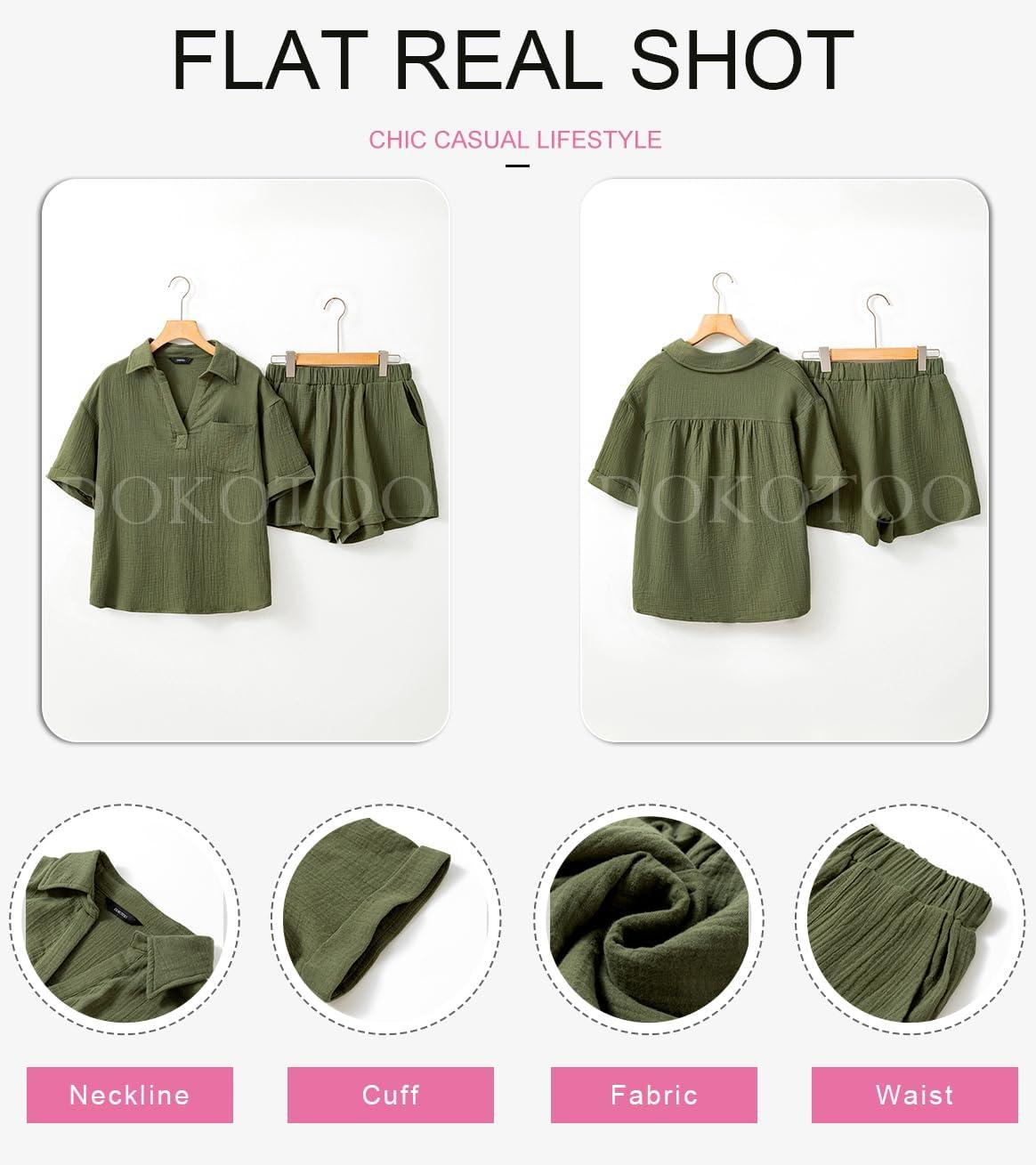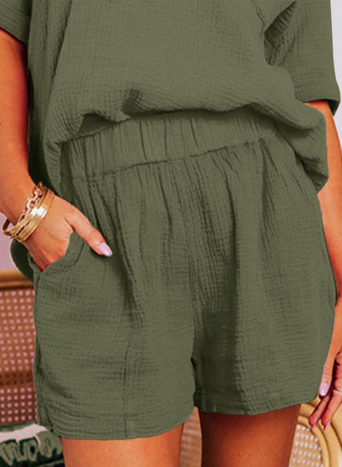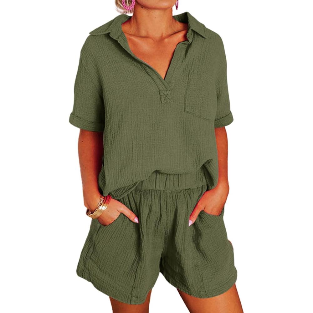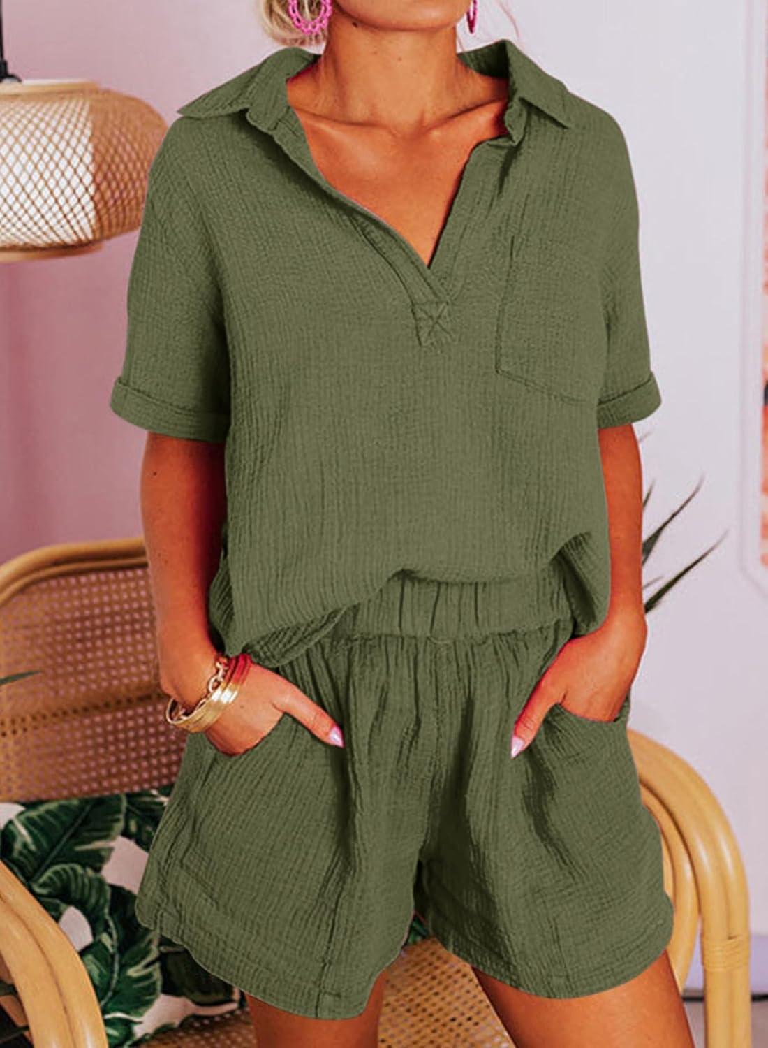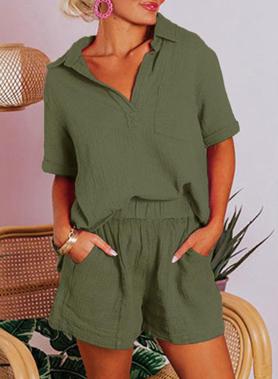 Dokotoo Women’s Two Piece Outfits V Neck Short Sleeve Shirts and High Waist Shorts Lounge Sets(Green)