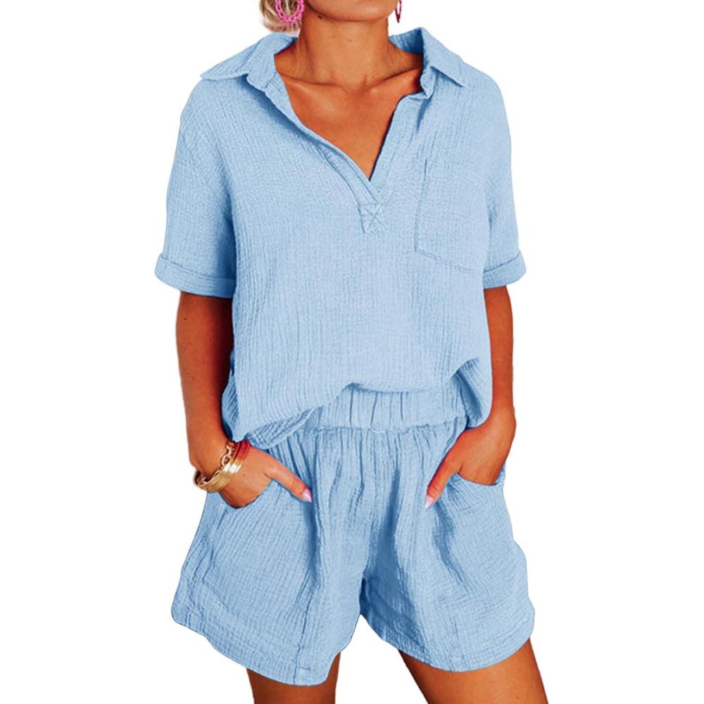 Dokotoo Women’s Two Piece Outfits V Neck Short Sleeve Shirts and High Waist Shorts Lounge Sets(Sky Blue)