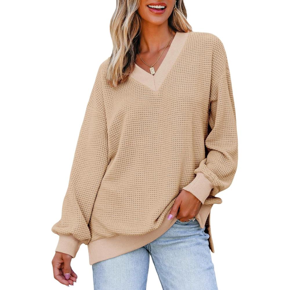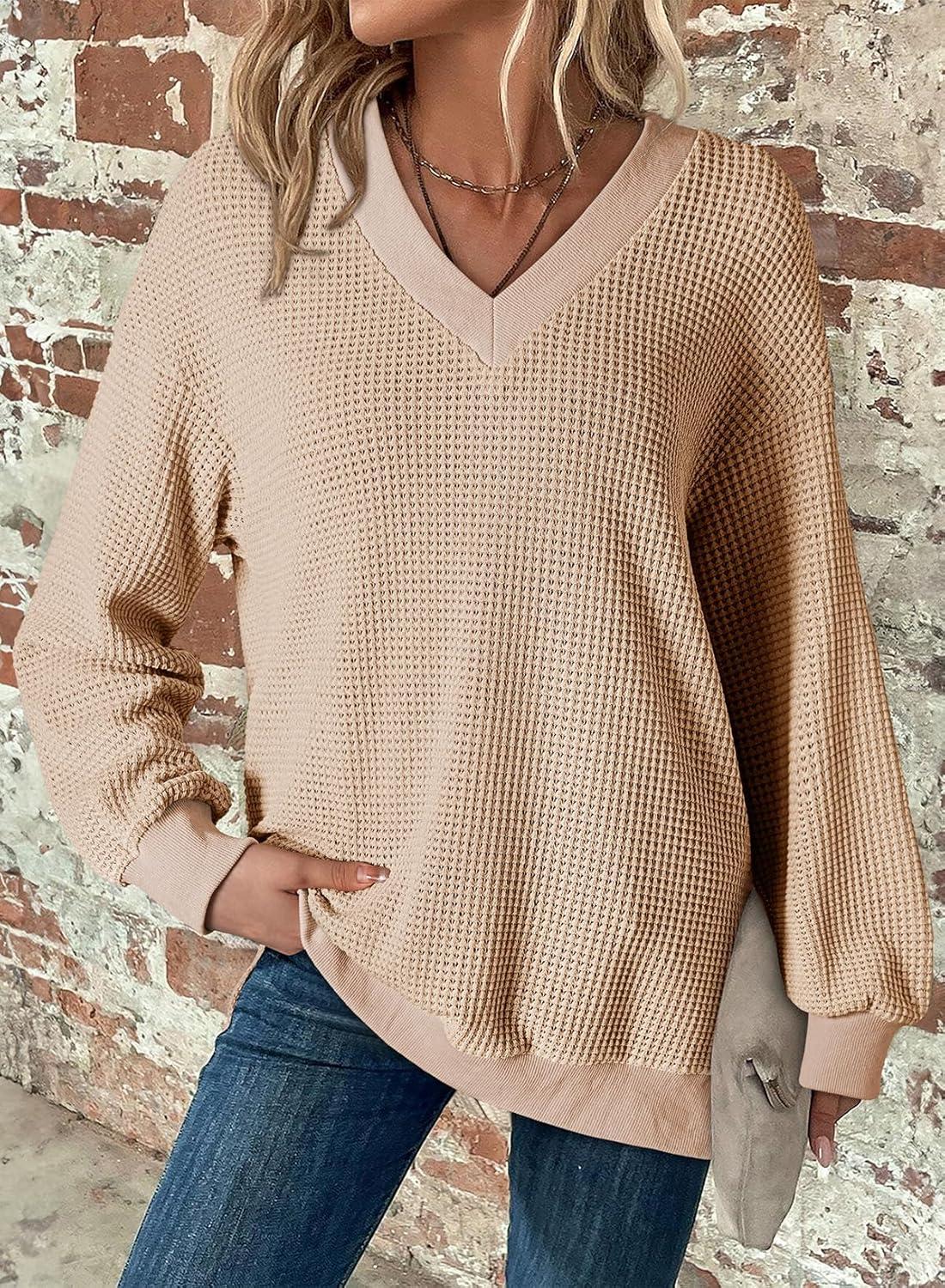 Dokotoo Women’s V Neck Long Sleeve Waffle Knit Tops Off Shoulder Oversized Pullover Sweater(Apricot)