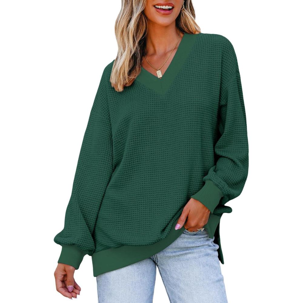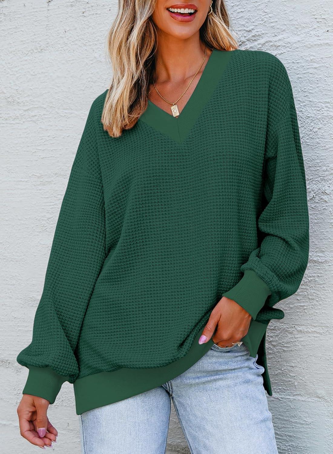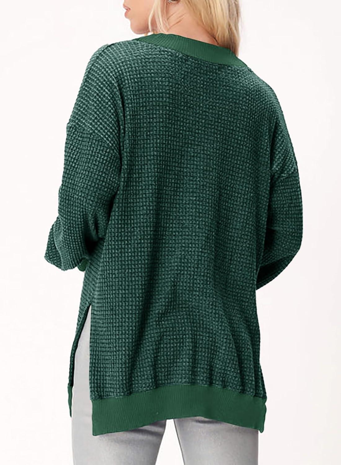 Dokotoo Women’s V Neck Long Sleeve Waffle Knit Tops Off Shoulder Oversized Pullover Sweater(Blackish Green)