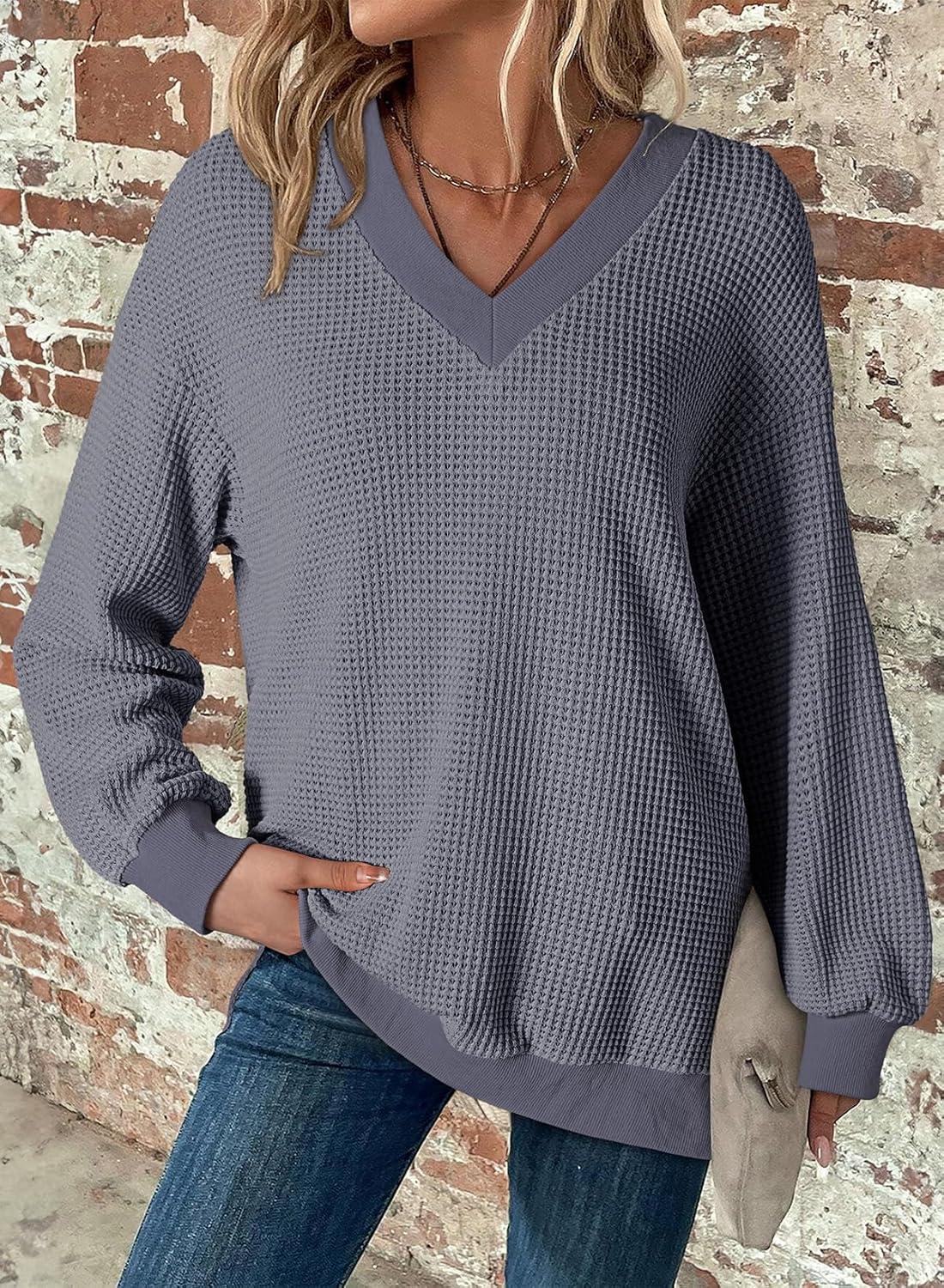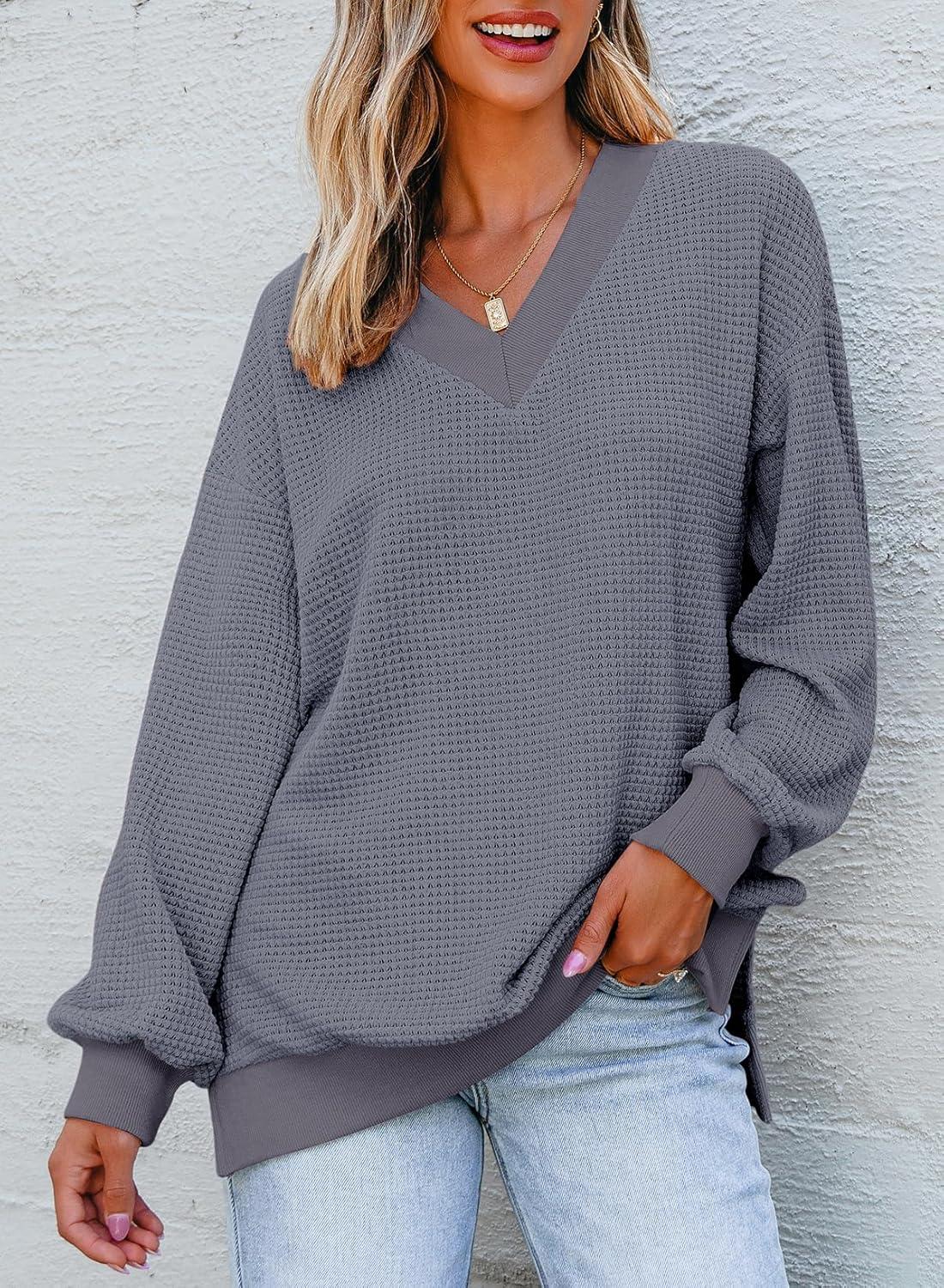 Dokotoo Women’s V Neck Long Sleeve Waffle Knit Tops Off Shoulder Oversized Pullover Sweater(Medium Grey)