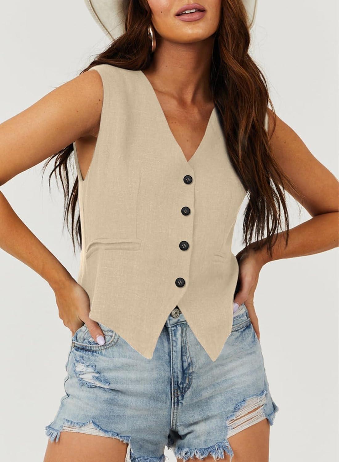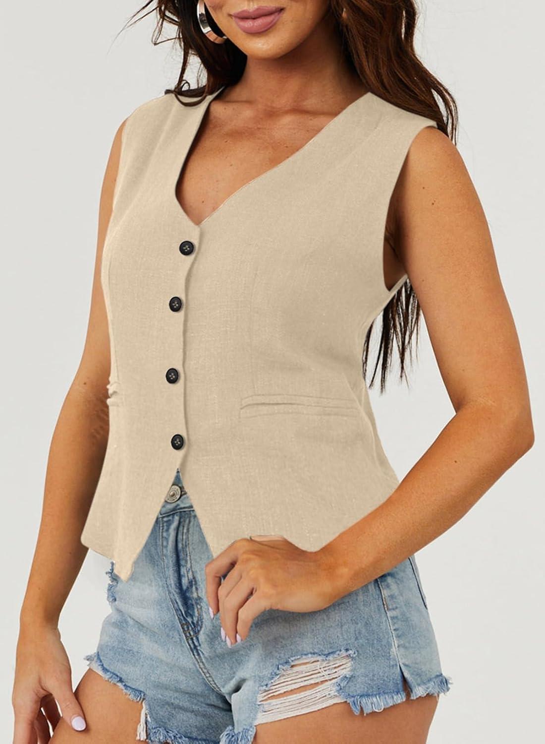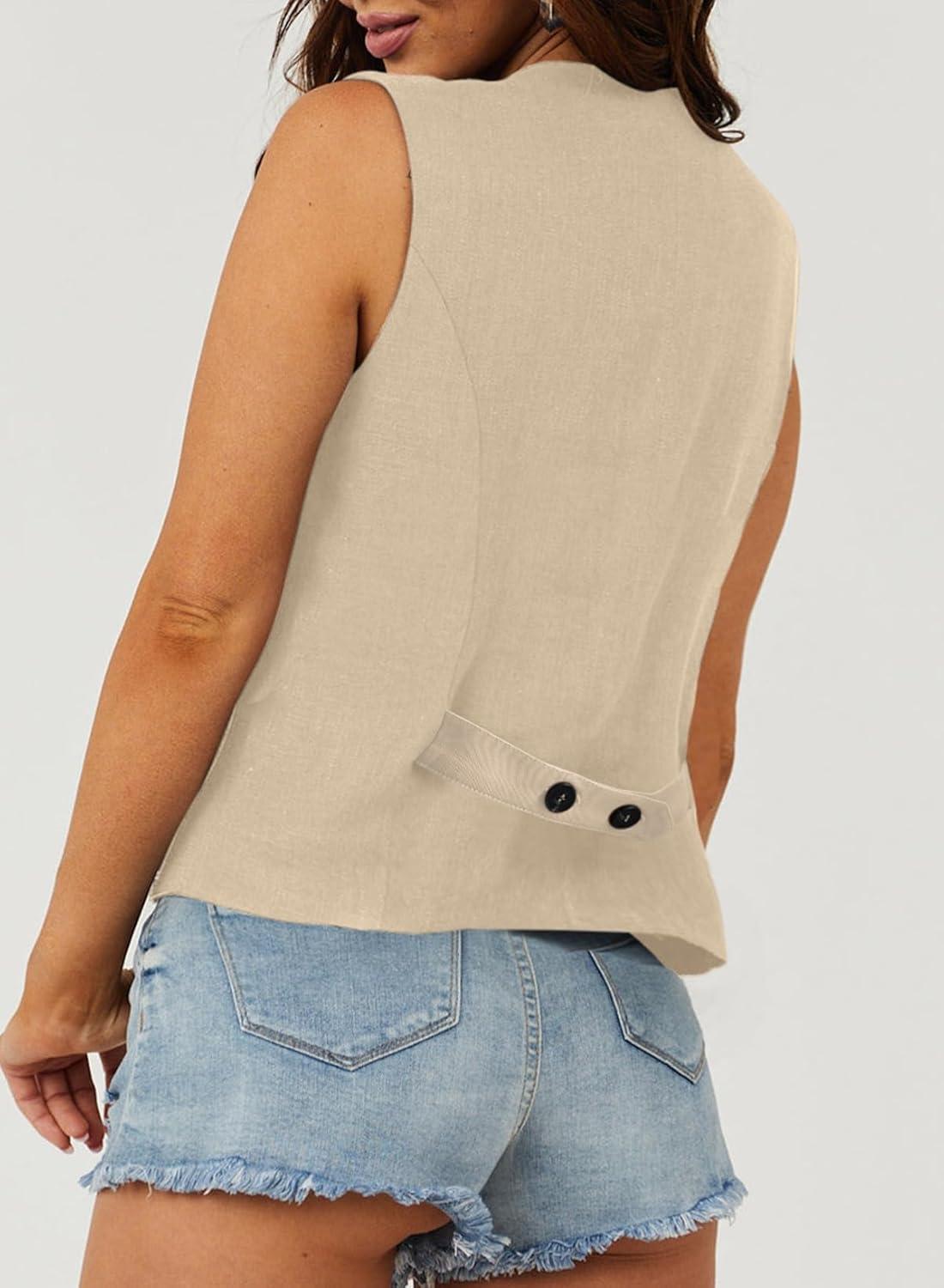 Dokotoo Womens Vest Dressy Casual V-Neck Button-Down Lined Suit Jacket Waistcoat Versatile Vests(Apricot)