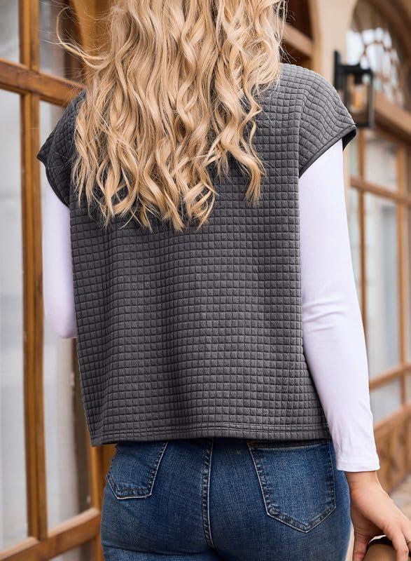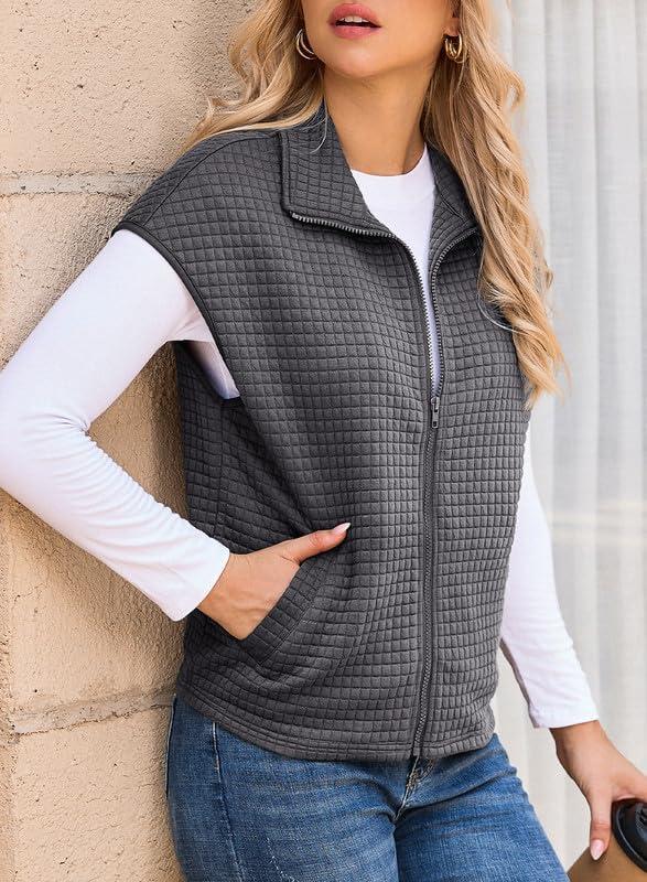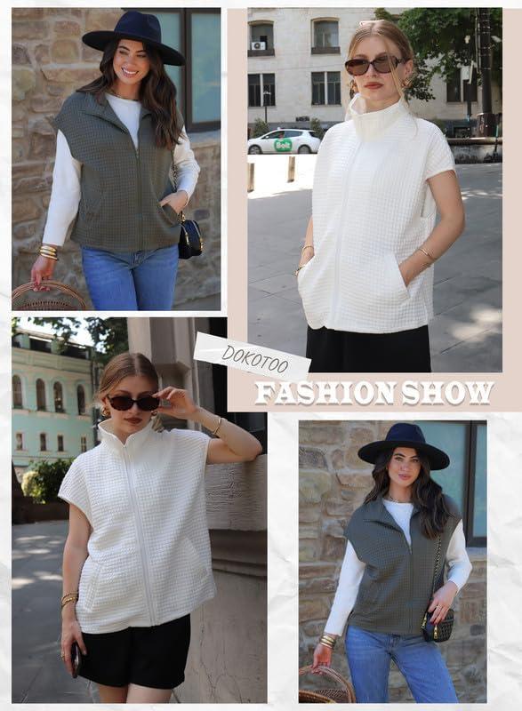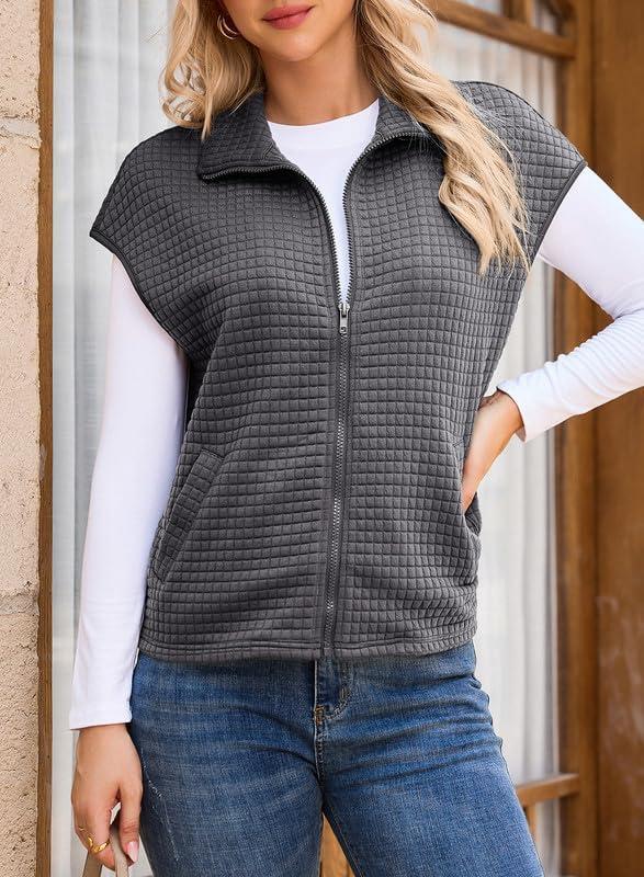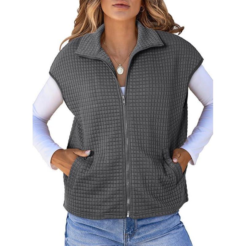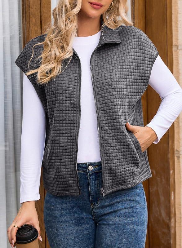 Dokotoo Womens Vest Tops 2025 Zipper Up Cap Sleeve Side Pockets Waffle Knit Sleeveless Oversized Vests(Gray)