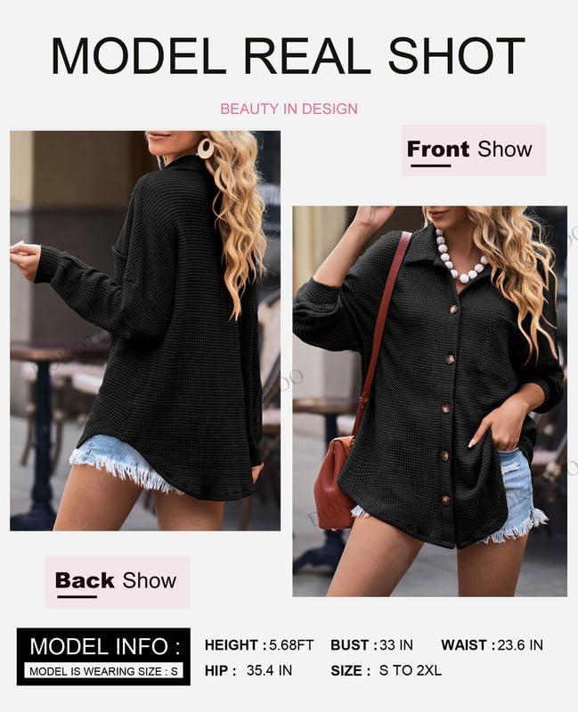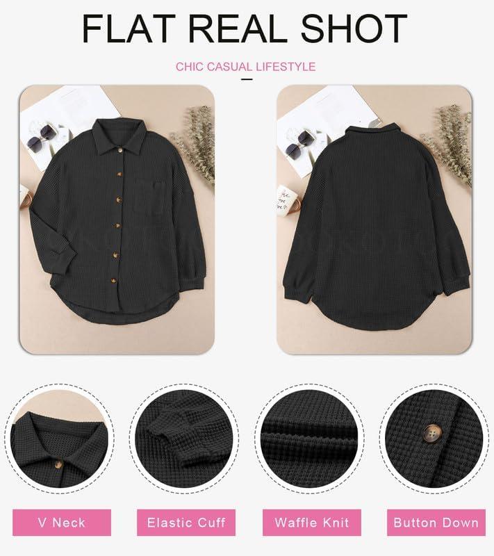 Dokotoo Womens Waffle Knit Shacket Jacket Casual Long Sleeve Button Down Shirts Dressy Blouses Tops(Black)