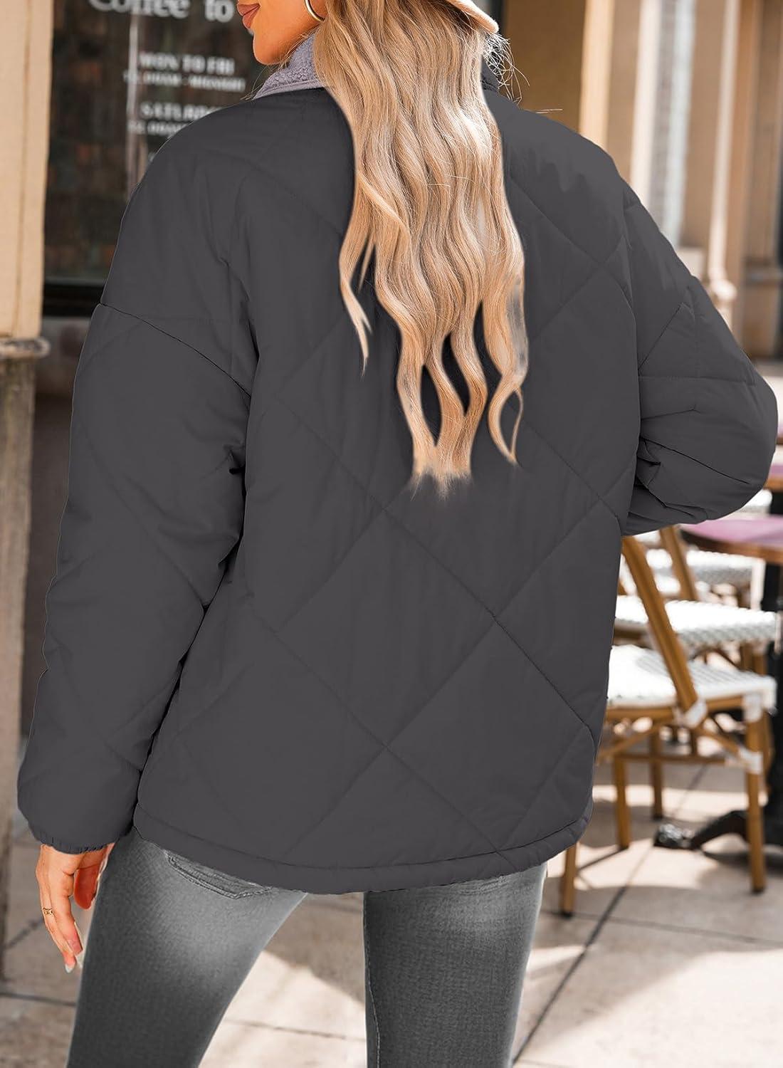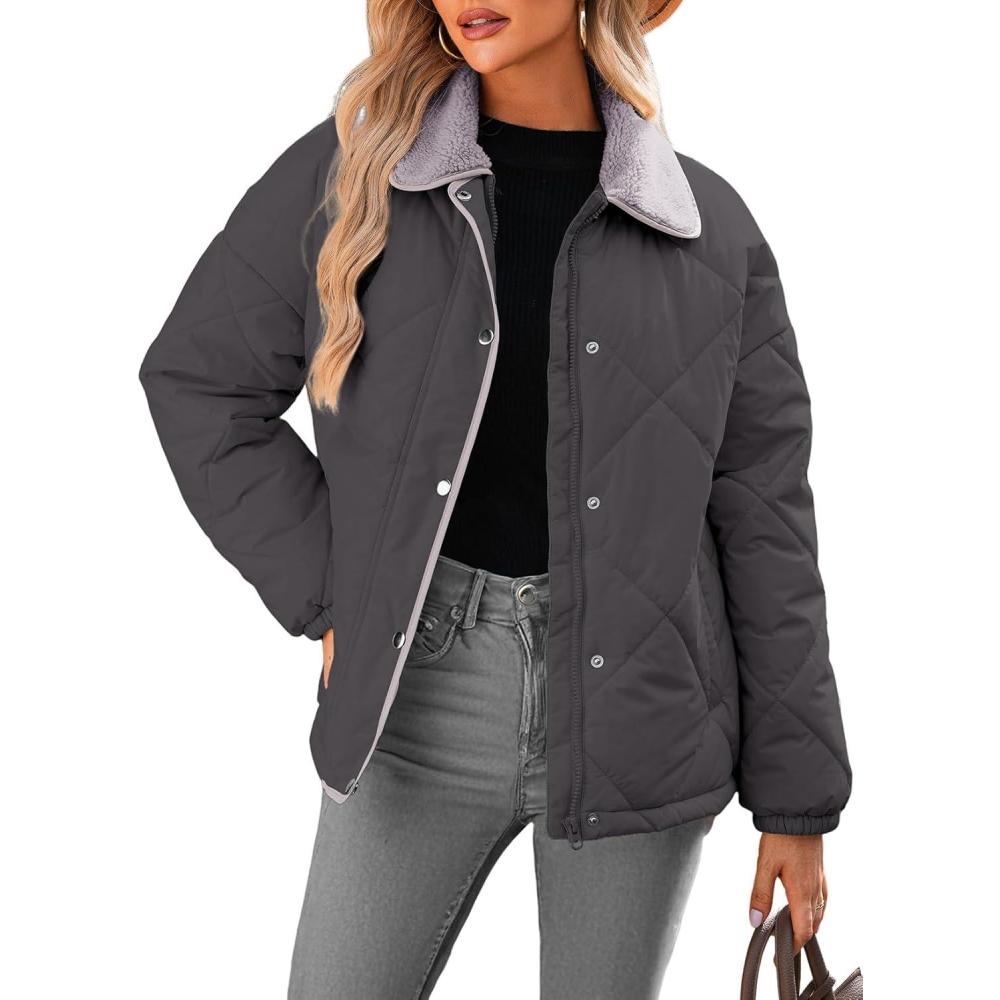 Dokotoo Women’s Winter Casual Quilted Jackets Long Sleeve Button Down Puffer Jacket Padded Outerwear Coats(Carbon Grey)