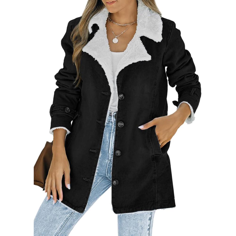 Dokotoo Womens Winter Warm Jean Jacket Stand Collar Wool Liner Sherpa Denim Coats Thicker Outerwear with Pockets(A Black)