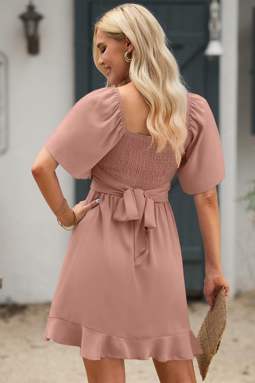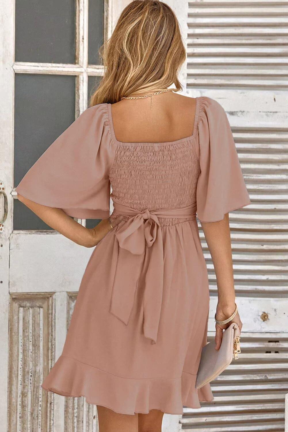 Dokotoo Women’s Wrap V Neck Short Flared Sleeve Wedding Guest Dress Smocked Elastic Waist Tiered Belted Ruffle Hem Mini Dress(Pink)