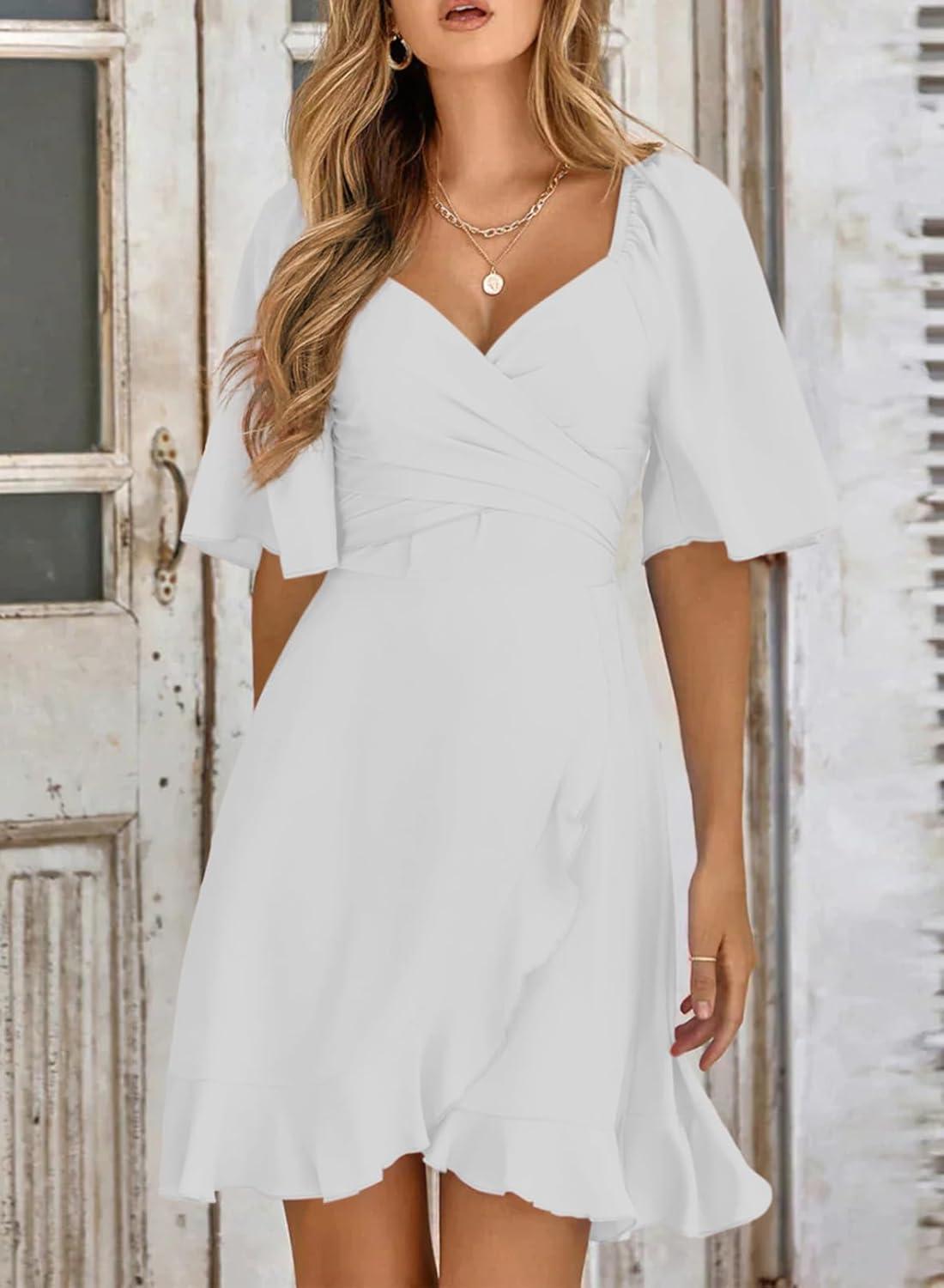 Dokotoo Women’s Wrap V Neck Short Flared Sleeve Wedding Guest Dress Smocked Elastic Waist Tiered Belted Ruffle Hem Mini Dress(White)